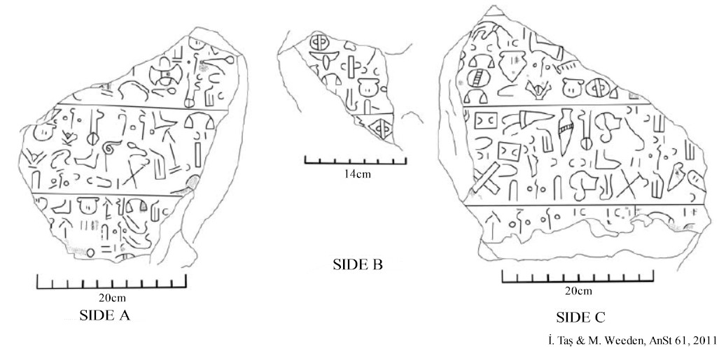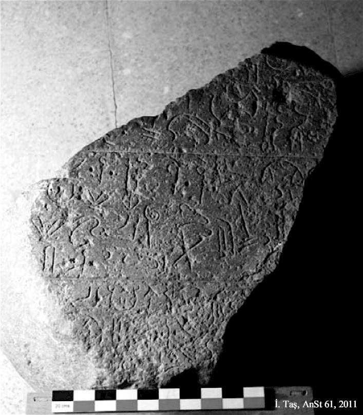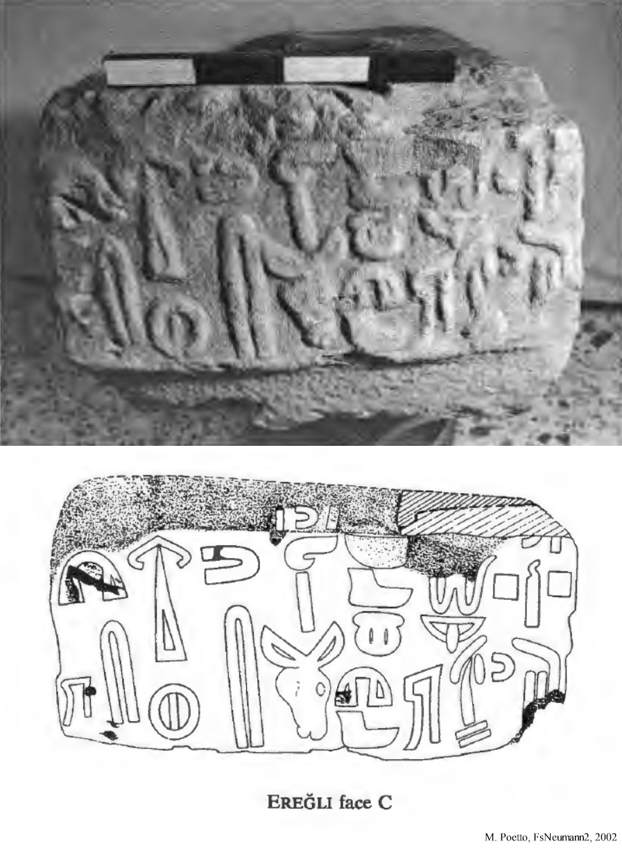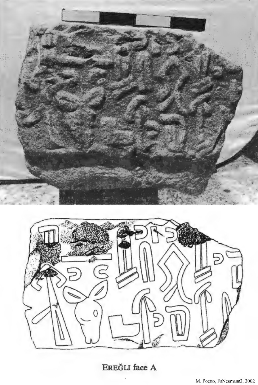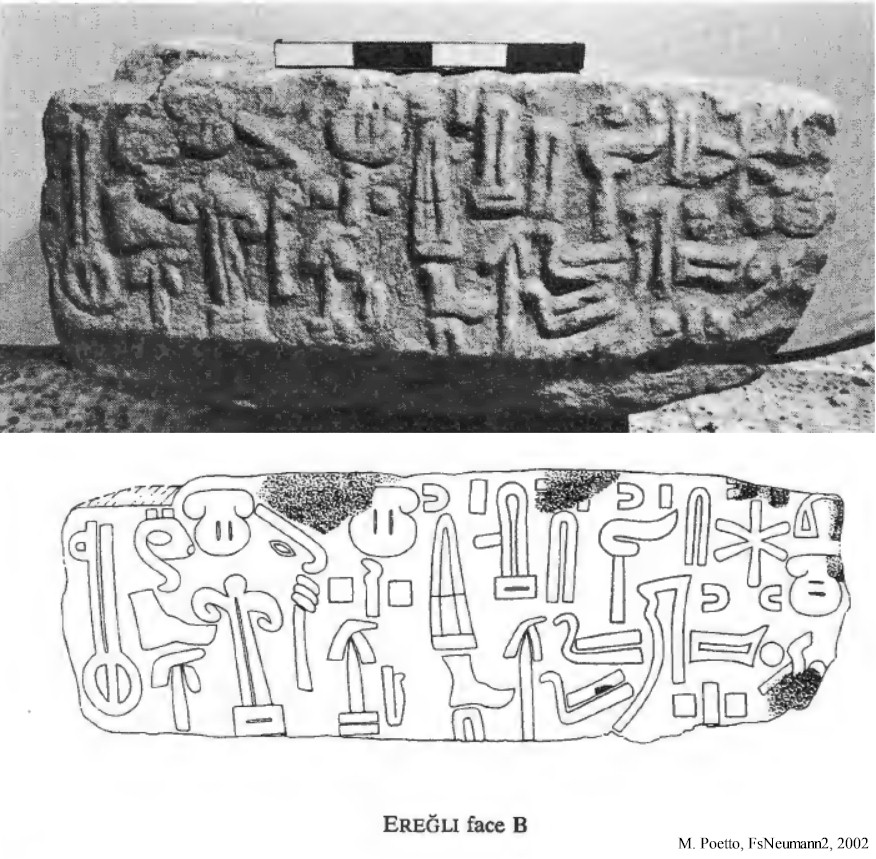 The rectangular block was dug up in 1991 in the garden of a private house and brought to the Ereğli Museum. It appears to be half of a stele base with an oval-shaped mortise hole that once must have held a stele. Three sides of the stele bear the middle section of a Hieroglyphic Luwian inscription. The preserved section of the text does not incorporate any names and probably concerns offerings for prosperity to the Storm-god. It probably belongs to the Neo-Hittite kingdom of Tabal, and a date in the 8th century BCE has been suggested. The block is about 55 cm in length, 33 cm in width, and 27 cm in height, and is currently in the Ereğli Museum.